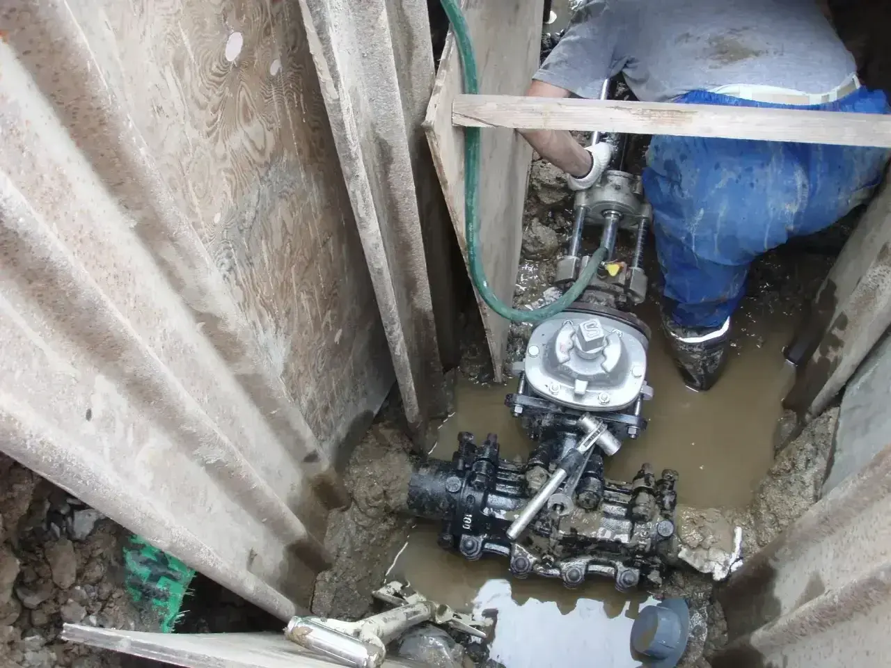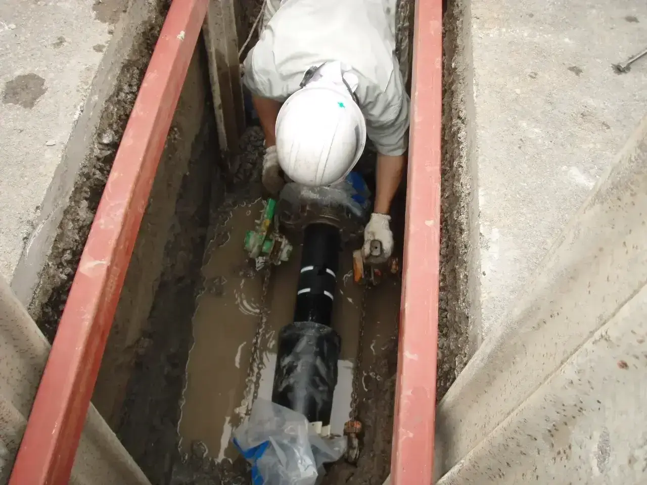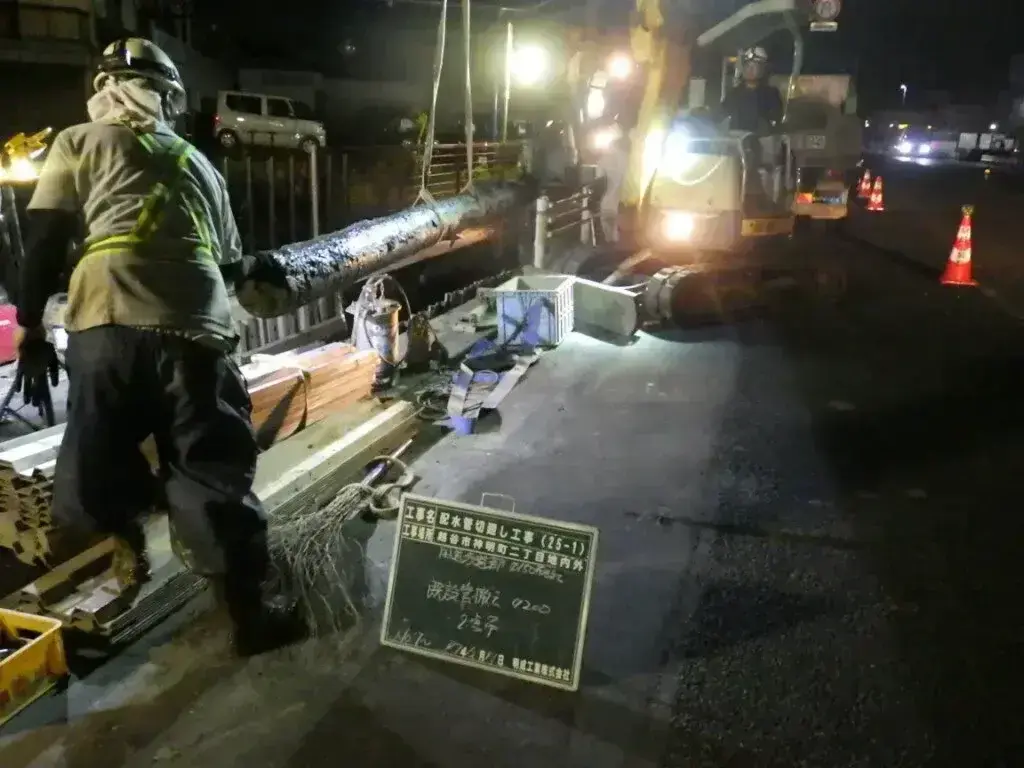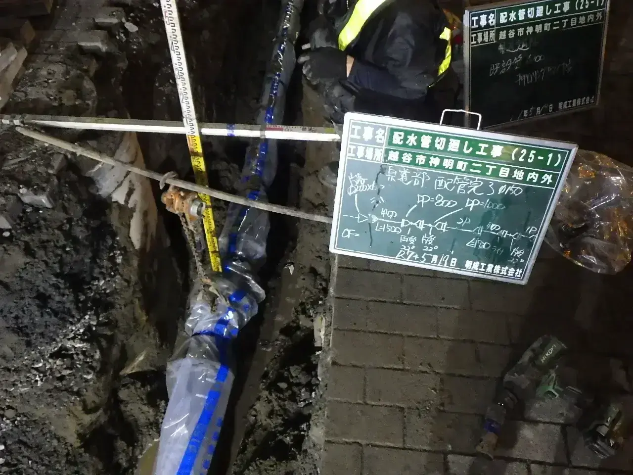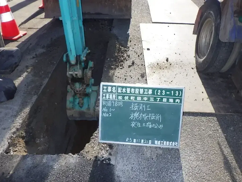 埼玉県北葛飾郡の明成工業株式会社では水道工事と土木工事の両方に対応できることが特長です。例えば、道路工事中に給水管の切回しが必要になった場合でも、自社にて申請・施工が可能であり迅速に対応をいたします。