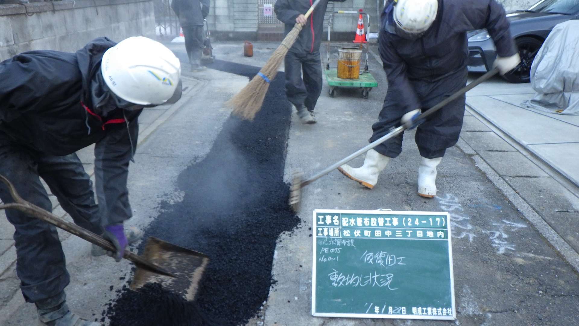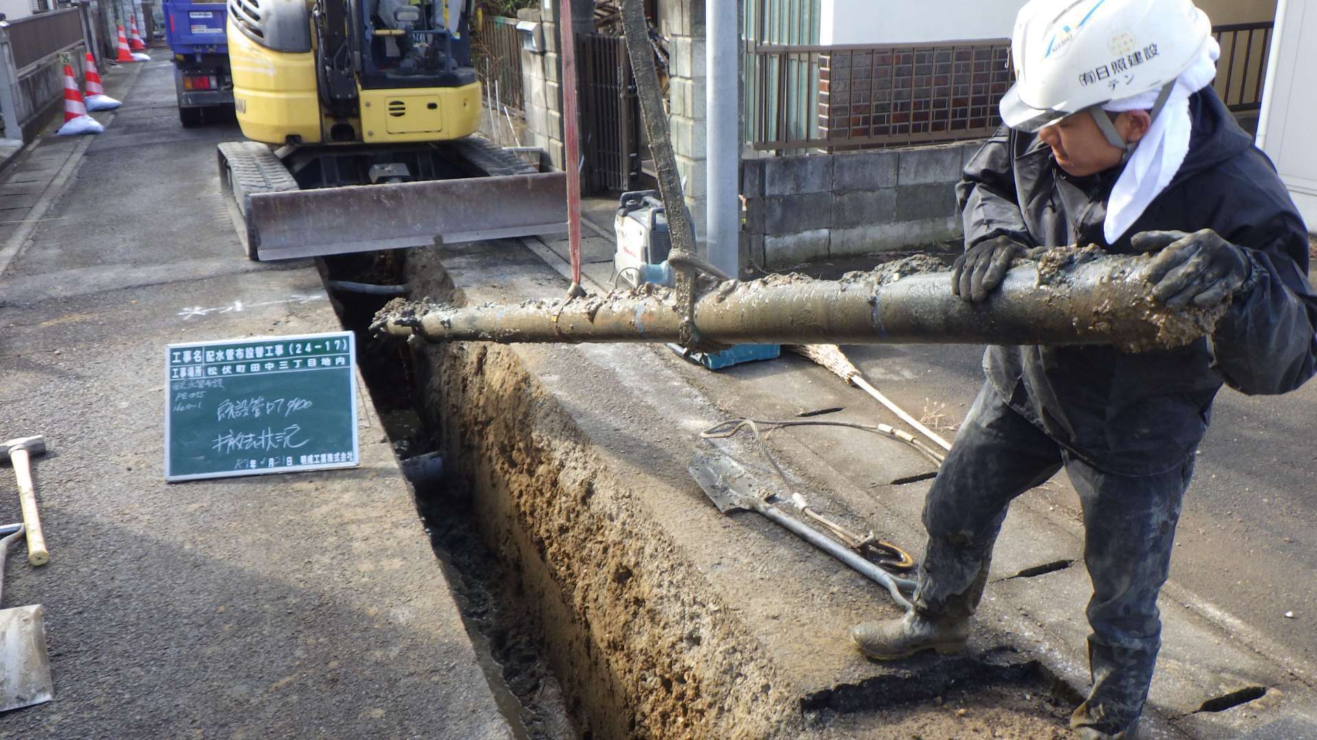 まずは道路を掘削し、既存の本管を撤去。その後、専用の継手を取り付けて新しい配管を接続し、機械で電気融着を行います。水圧試験を行い、水漏れの有無を確認し問題がなければ各家庭へ接続する給水管を布設します。安全に、そして確実に給水の切替ができました。生活に欠かせないインフラを守る、大切な工事です。