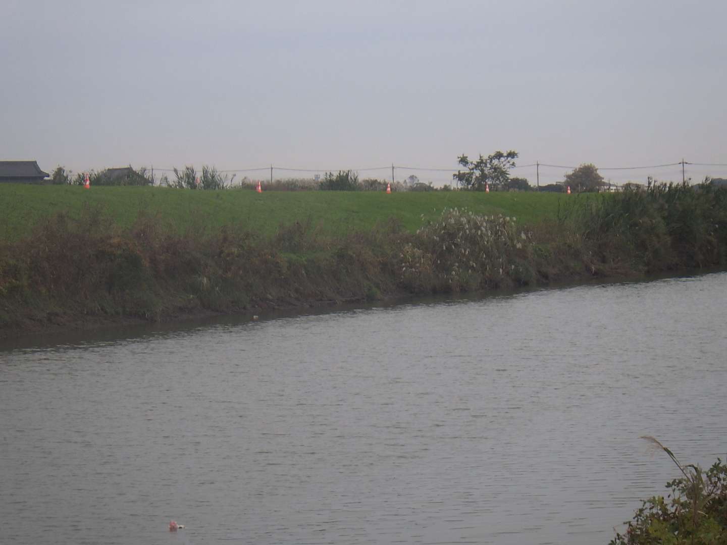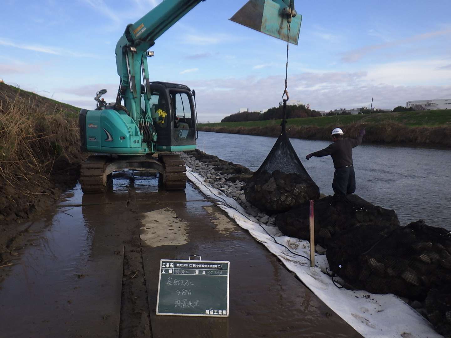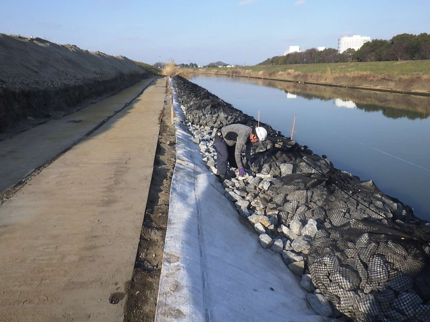 松伏町金杉地内における一級河川中川の護岸工事 延長 L=95m、河川土工 1式 法覆護岸工(かごマット) A=381m2、じゃかご L=2…
