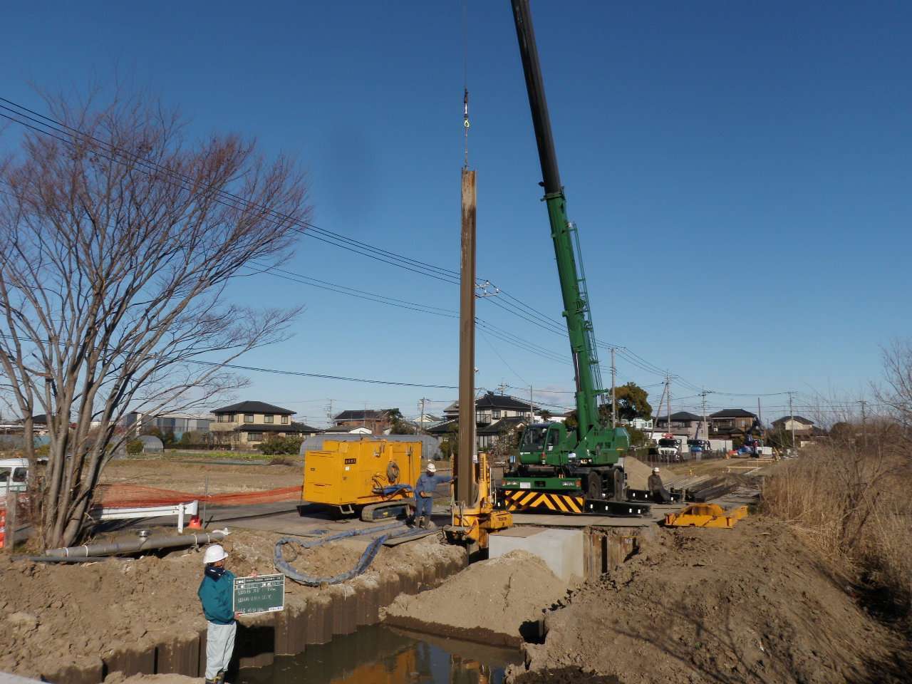 松伏町金杉地内における一級河川中川の護岸工事 延長 L=95m、河川土工 1式 法覆護岸工(かごマット) A=381m2、じゃかご L=2…