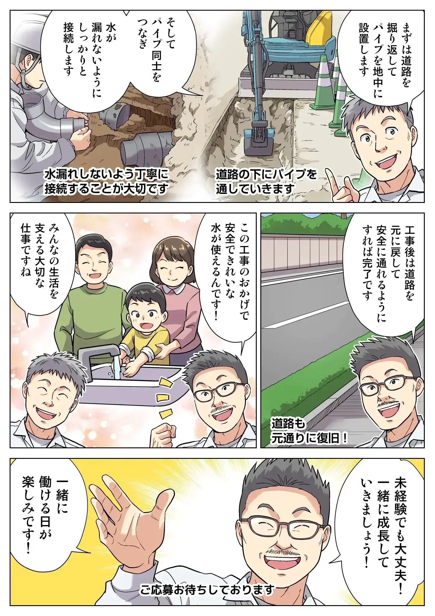 越谷市・松伏町地域のライフラインである水道管の布設・更新工事を数多く手がけています。また、宅内の漏水修繕にも対応し生活に直結するインフラを扱うため、高い安全意識と確かな技術が求められます。人々の暮らしを“水”で支える重要な役割です。
