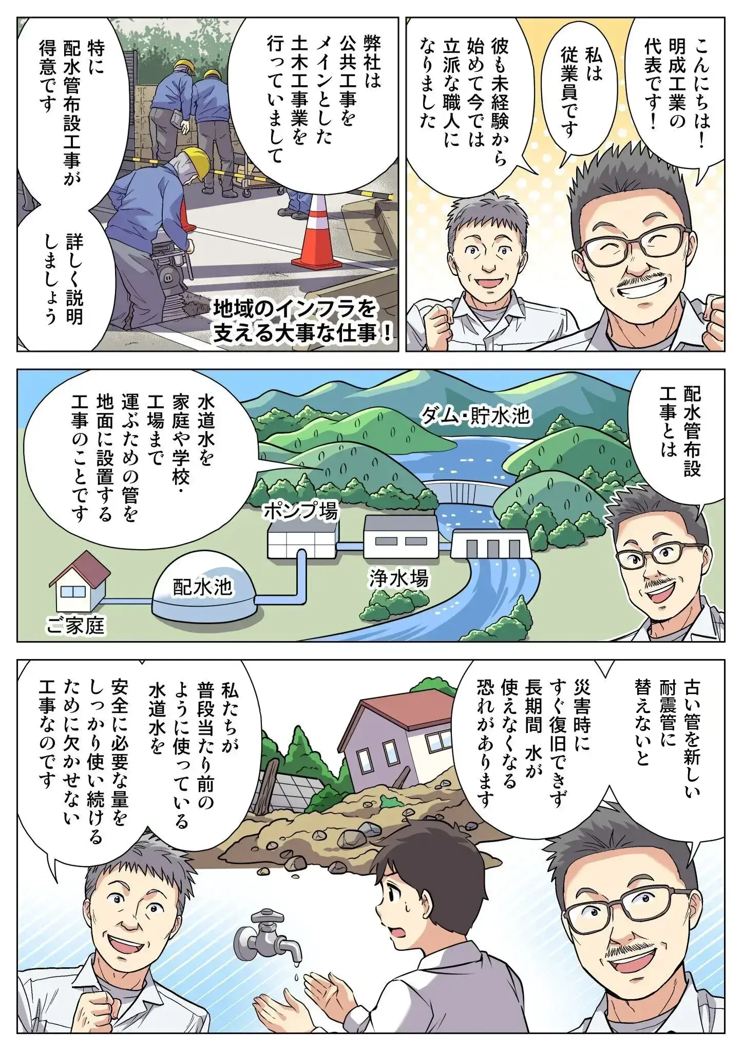埼玉県北葛飾郡松伏町に本社を構える明成工業株式会社では、水道工事と土木工事を中心に、地域のインフラ整備を支える工事を手がけています。道路や河川の整備、水道管の布設・改修など、地域の暮らしに直結する大切な工事を一手に引き受け、地元の安心と安全を支え続けています。