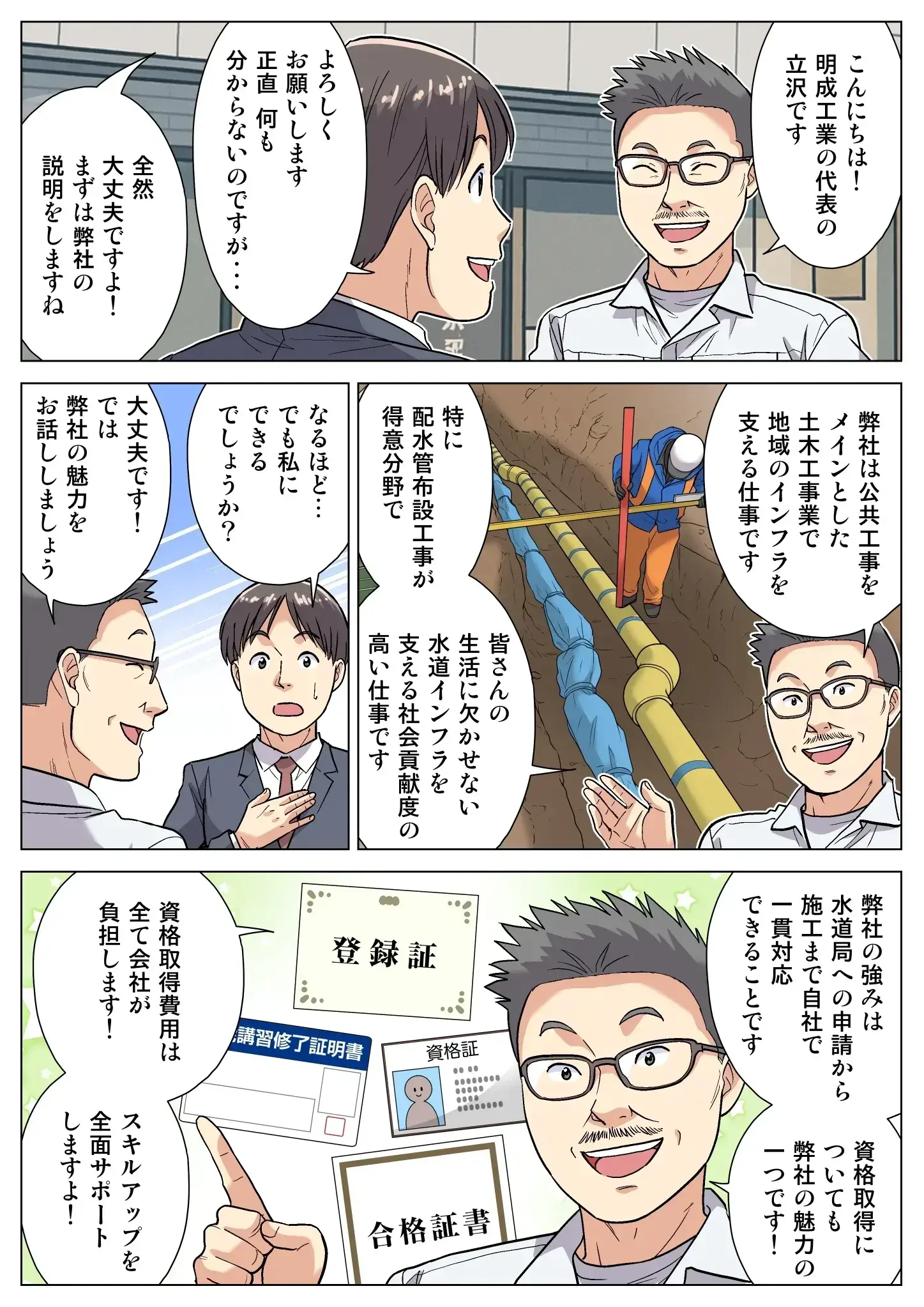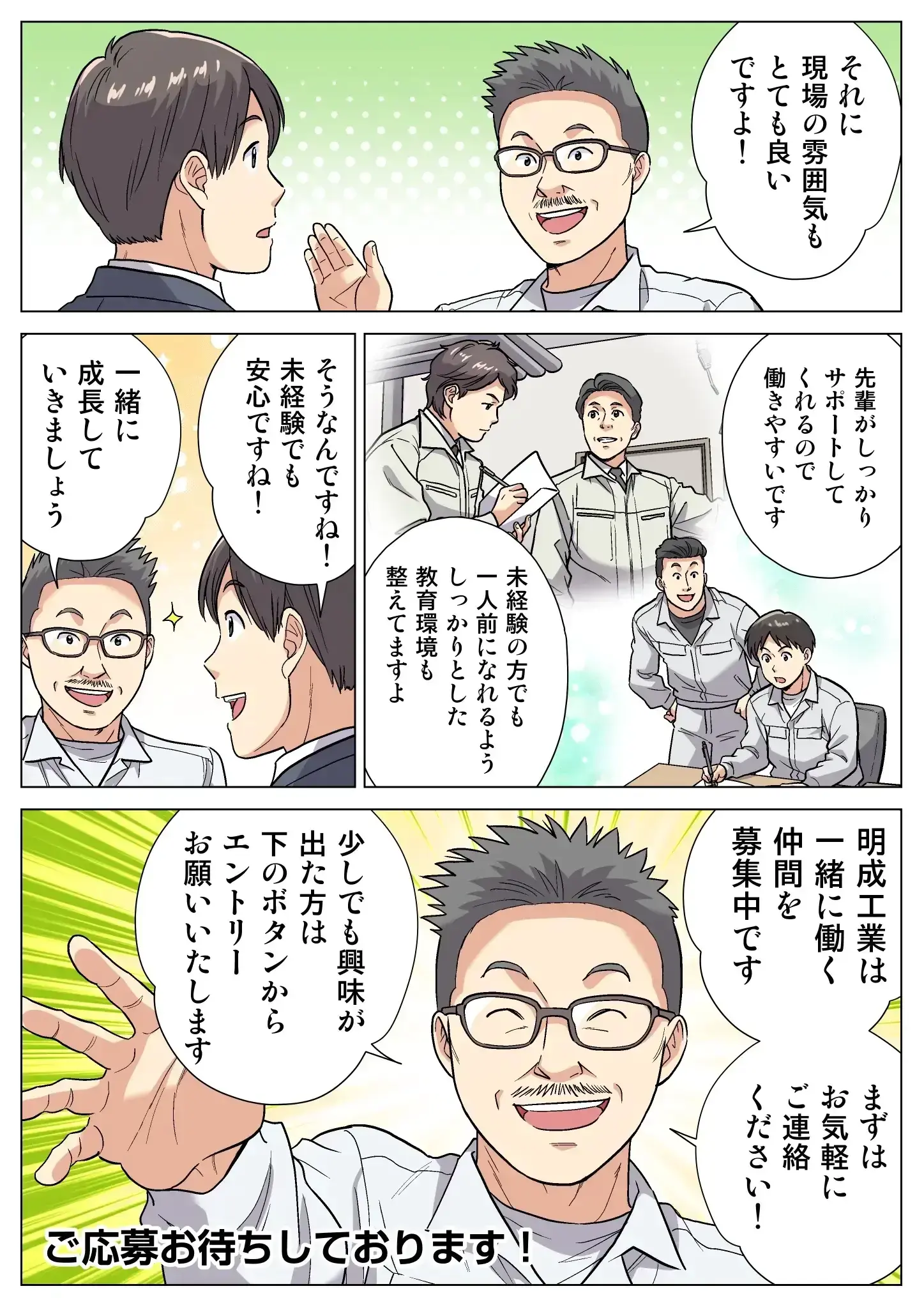 埼玉県北葛飾郡松伏町に拠点を構える明成工業株式会社では、未経験の方でも安心してスタートできる環境を整えています。教育体制やサポート制度が充実しているので、一歩ずつ成長できます。もちろん、経験者の方にもやりがいを持って活躍していただける、風通しのよい職場です。